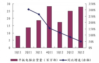 本文導(dǎo)讀:平板電腦新產(chǎn)品涌現(xiàn),打破iPad一家獨(dú)大局面。據(jù)中企顧問網(wǎng)統(tǒng)計(jì),2012年3季度,全球平板電腦出貨量為2780萬部,同比增長49.5%。其中蘋果iPad系列出貨量為1400萬部,占比為50.4%,比2011年同期下滑9.3個(gè)百分點(diǎn)。