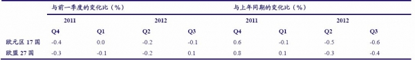修正后的三季度歐盟和歐元區(qū)GDP數(shù)據(jù),繼續(xù)印證了歐洲經(jīng)濟(jì)處于溫和衰退和底部徘徊的格局。其中,歐元區(qū)17國第三季度經(jīng)濟(jì)環(huán)比下滑0.1%,同比下滑0.6%。在第三季度歐元區(qū)有九個成員國的GDP出現(xiàn)萎縮,一個成員國的GDP停滯,四個成員國的GDP實現(xiàn)增長。受歐債危機(jī)拖累,德國、法國第三季度GDP季率增速放緩至0.2%。