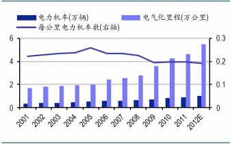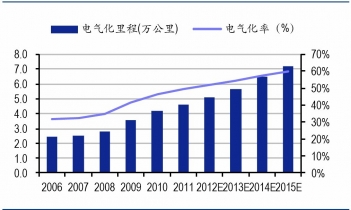 根據(jù)鐵路“十二五”發(fā)展規(guī)劃的遠景目標(biāo),到2015年,全國鐵路營業(yè)里程達12萬公里左右,復(fù)線率和電化率分別達到50%和60%以上。截至2011年,全國鐵路營業(yè)里程達到9.3萬公里,同比增長2.3%,電氣化里程4.6萬公里,電化率49.4%,若完成十二五的規(guī)劃目標(biāo),意味著未來三年電氣化里程將達到2.7萬公里,占2011年電氣化里程存量的58.7%。