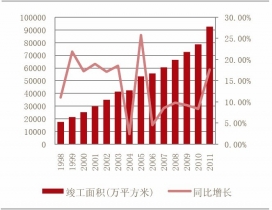 1998-2011年房地產(chǎn)竣工面積及增長(zhǎng)
