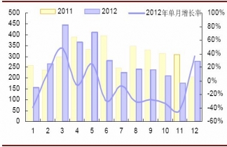 2012年12月裝載機(jī)行業(yè)銷量12475臺(tái),同比下降37%,出口2517臺(tái),同比增長11.87%%,出口表現(xiàn)優(yōu)于內(nèi)銷。2013年1月裝載機(jī)銷量8704臺(tái),同比上升22.7%,出口1621臺(tái),同比增長18.8%。因此1月去年是春節(jié),因此各企業(yè)銷量出現(xiàn)不同程度的回升,由于煤炭投資等仍維持低迷,因此裝載機(jī)一季度仍將下降。柳工集團(tuán)2013年1月出口整機(jī)500多臺(tái),同比增長80%以上,整機(jī)銷售再創(chuàng)歷史同期新高。
