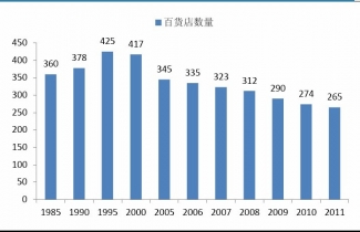 隨著百貨店的倒閉及整合,百貨店的數(shù)量不斷下降,截至2011年僅為265家,相對最高點的1995年,下降38%。