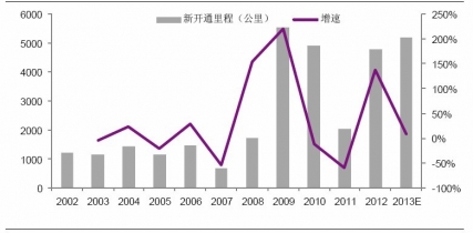 2012年,鐵路投資規(guī)劃經(jīng)歷了先后3次上調(diào),基建投資目標(biāo)由年初時(shí)的4000億元最終上調(diào)至5160億元,而且增加的1000多億中有400億是來自于財(cái)政資金,充分體現(xiàn)了國(guó)家對(duì)鐵路建設(shè)的重視與支持。在此推動(dòng)下,從去年7月鐵路投資開始轉(zhuǎn)正,結(jié)束了長(zhǎng)達(dá)15個(gè)月的下滑,全年完成基建投資5185億元,增長(zhǎng)13%,而實(shí)際新開工項(xiàng)目達(dá)到了22個(gè),大幅超出年初時(shí)計(jì)劃的9個(gè)。