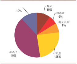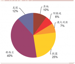 由于運輸條件限制,全球乳制品出口液態(tài)奶占比較小,主要以干乳制品,特別是奶粉貿(mào)易為主。2012年全球主要奶粉出口國及地區(qū)包括新西蘭、歐盟、美國、澳大利亞及阿根廷,占到了全球出口量的90%以上,其中新西蘭奶粉更是占到了全球出口量的43.7%,直接影響全球奶粉價格走勢。