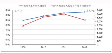 根據(jù)中國海關(guān)統(tǒng)計,2012年我國進口奶粉57.9萬噸,其中新西蘭奶粉占80%,2012年恒天然乳品拍賣均價為3210美元/噸,考慮關(guān)稅和運費等因素,配額內(nèi)、外到岸價分別為21361、22378元/噸,遠低于國內(nèi)31000元/噸的奶粉生產(chǎn)成本,壓制了國內(nèi)原奶價格上漲空間,2012年國內(nèi)原奶均價同比僅增長2.7%,為三聚氰胺事件以來新低。新西蘭奶粉價格低廉主要原因在于1)新西蘭奶農(nóng)享受政府高額補貼2)新西蘭土地資源充裕,有利于大規(guī)模養(yǎng)殖3)2008年來新西蘭奶粉產(chǎn)量大幅上升,五年累計增長85%,供應(yīng)充足導致價格維持低位。、