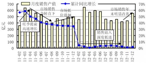 本文導(dǎo)讀:10、11月市場需求依然低迷,當(dāng)月銷售產(chǎn)值分別為419.73億、434.50億元,月度產(chǎn)值降至年內(nèi)較低水平,同比分別下降6.5%和11.5%左右;進(jìn)入12月后,市場需求開始明顯改善,當(dāng)月銷售產(chǎn)值反彈至550.66億元,同比增長10.5%左右,環(huán)比增長26.5%左右。