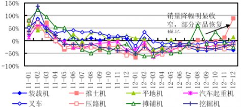 2011年1月~2012年12月主要工程機械產(chǎn)品月度銷量同比增速
