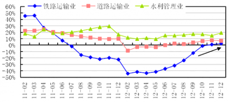 2011年2月~2012年12月鐵路、道路、水利累計投資增速