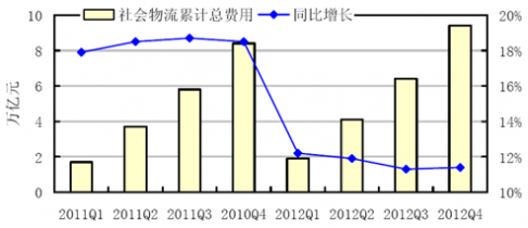 2012年中國物流要素成本全面上漲,社會物流總費用高居不下