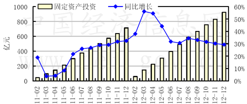 2011年2月~2012年12月工程機(jī)械行業(yè)投資完成額及同比增速