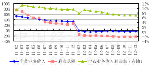 由于銷售收入持續(xù)負增長,再加上企業(yè)管理費用和財務費用維持高位,行業(yè)利潤總額大幅下滑,盈利水平繼續(xù)下降。1~12月,行業(yè)實現(xiàn)利潤總額414.55億元,同比下降22.94%,降幅較上季度末有所縮小;主營業(yè)務收入利潤率降至7.04%,為年內(nèi)最低利潤率,而上年同期為8.87%。