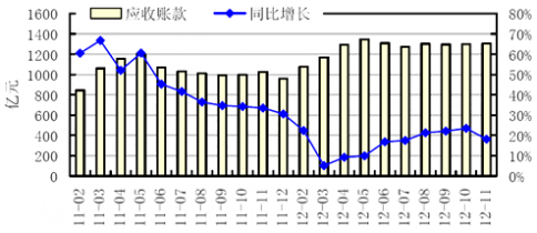 2012年以來,工程機械市場競爭加劇,主要企業(yè)紛紛加大促銷力度,延期付款、低首付、零首付、有買有贈的營銷策略頻繁被采用,導致行業(yè)應收賬款規(guī)模不斷擴大,回款壓力加大。為此,主要企業(yè)逐步控制信用銷售規(guī)模,并采取了一定措施來抑制應收賬款的擴大,如三一重工和徐工機械均采取了無追索權(quán)保理等手段來減少壞賬,9月以來行業(yè)應收賬款規(guī)模未繼續(xù)擴大。截至11月末,行業(yè)應收賬款余額1305.12億元,同比增長18.14%,應收賬款規(guī)模維持高位,達到1~11月行業(yè)主營業(yè)務收入的25%左右。