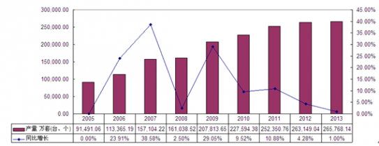 2013年我國燈具及照明裝置產(chǎn)量為265768.14萬套(臺、個),同比增長1.0%。