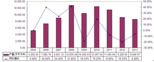2005-2013年我國實(shí)木木地板行業(yè)產(chǎn)量統(tǒng)計(jì)