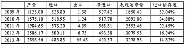 2009-2013年我國甲醇供需平衡表(單位:萬噸)