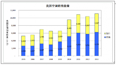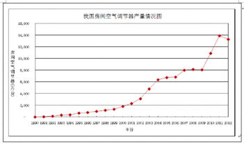 目前空氣過濾器主要應(yīng)用于家用及商用電器,包括空調(diào)和空氣凈化器。空調(diào)是空氣過濾器的一個(gè)重要的應(yīng)用方向,本公司的主要產(chǎn)品之一為空調(diào)過濾網(wǎng)。空調(diào)行業(yè)的技術(shù)進(jìn)步、居民消費(fèi)水平的提高、人口的增長、城市化進(jìn)程的推進(jìn)及氣候變暖等因素,共同促成了近年來空調(diào)行業(yè)的良好發(fā)展。根據(jù)《建筑研究與信息學(xué)會(huì)統(tǒng)計(jì)通報(bào)(英國)》(BSRIA),2012 年度,全球空調(diào)行業(yè)的市場規(guī)模為875 億美元;亞太地區(qū)市場規(guī)模為494 億美元,其中,中國和日本市場合計(jì)占比82%,是集中而龐大的空調(diào)消費(fèi)市場。近年來中國的空調(diào)產(chǎn)量也增長迅速,根據(jù)國家統(tǒng)計(jì)局公布的數(shù)據(jù),2012 年我國房間用空氣調(diào)節(jié)器產(chǎn)量達(dá)到13,281 萬臺(tái),近十年房間用空氣調(diào)節(jié)器產(chǎn)量的年均復(fù)合增長率達(dá)到15.53%,近年來我國房間用空氣調(diào)節(jié)器的年產(chǎn)量已穩(wěn)定在世界年產(chǎn)量的80%以上。我國房間用空氣調(diào)節(jié)器的產(chǎn)量及空調(diào)的銷量情況如下: