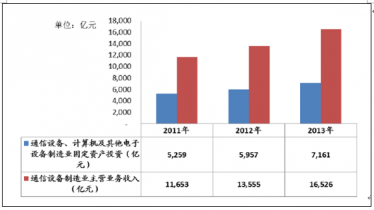 隨著我國經(jīng)濟(jì)的發(fā)展與基礎(chǔ)設(shè)施建設(shè)的不斷完善,近年來固定資產(chǎn)投資總額不斷增長,通信設(shè)備、計算機(jī)及其他電子設(shè)備制造業(yè)固定資產(chǎn)投資隨之持續(xù)增長,在這些有利因素的拉動下,巨大的投資增長直接帶動了主要通信設(shè)備的旺盛需求,通信設(shè)備制造業(yè)市場容量不斷擴(kuò)大。根據(jù)統(tǒng)計,2013 年,我國通信設(shè)備制造業(yè)主營業(yè)務(wù)收入達(dá)到16,526.45 億元,同比增長21.92%。