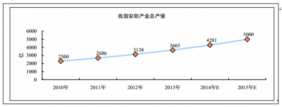 據(jù)調(diào)查數(shù)據(jù)顯示,“十一五”期間,我國(guó)安防行業(yè)規(guī)模迅速擴(kuò)大。2010 年,安防企業(yè)達(dá)到了 25,000 家左右,從業(yè)人員約120 萬(wàn)人;行業(yè)總產(chǎn)值達(dá)到 2,300 多億元,其中安防產(chǎn)品產(chǎn)值約為 1,000 億元,安防工程和服務(wù)市場(chǎng)約為 1,300億元。《中國(guó)安防行業(yè)“十二五”發(fā)展規(guī)劃》提出,到“十二五”末期,要實(shí)現(xiàn)安防產(chǎn)業(yè)規(guī)模翻一番的總體目標(biāo),年增長(zhǎng)率達(dá)到 20%左右,預(yù)計(jì)2015 年總產(chǎn)值達(dá)到 5,000 億元。“十二五”期間,安防產(chǎn)業(yè)繼續(xù)保持快速增長(zhǎng)的態(tài)勢(shì),未來(lái)我國(guó)安防產(chǎn)業(yè)市場(chǎng)容量巨大。