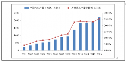 2001-2013 年中國汽車產(chǎn)量和占全世界汽車總產(chǎn)量的比重