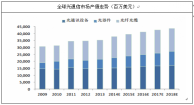 近年來,全球光通信市場產(chǎn)值一直保持增長趨勢。數(shù)據(jù)顯示,2014年全球光通信市場產(chǎn)值達(dá)到近 352 億美元的規(guī)模。其中光器件占 19%、光纖光纜占 39%、光通信設(shè)備占 42%。中國正在逐步成為世界上最大的光通信市場,到 2012 年中國光纖市場全球市場份額已達(dá) 49%,光器件廠商全球市場份額逐漸擴(kuò)大,光網(wǎng)絡(luò)設(shè)備廠商已居于全球領(lǐng)先地位。