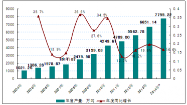 2004-2014年中國(guó)包裝飲用水行業(yè)產(chǎn)量走勢(shì)