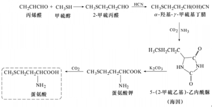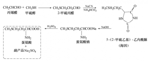 法國的安迪蘇公司:2-甲硫丙醛與NaCN、NH4HCO3 縮合生成海因,然后海因在NaOH 溶液中水解,生成蛋氨酸鈉,再用硫酸酸化,生成副產(chǎn)物Na2SO4,原料CO2 和NH3 在工藝中循環(huán)使用,總收率可以達到83%,其工藝流程如下圖。