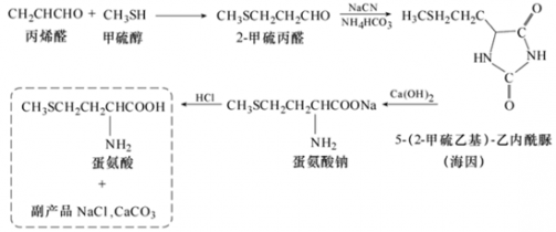 日本的曹達公司: 2-甲硫丙醛與NaCN、NH4HCO3 縮合生成海因,然后海因在Ca(OH)2 溶液中水解,生產(chǎn)蛋氨酸鹽,再用HCl 酸化制成蛋氨酸,生成副產(chǎn)物NaCl 和CaCO3,工藝過程中NH3 循環(huán)使用。其工藝流程圖如下圖 所示。
