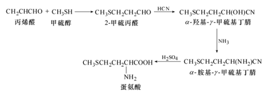 美國的孟山都公司的工藝更為簡單,主要由β-甲硫基丙醛、氫氰酸和硫酸,經(jīng)過中間物α-羥基γ-甲硫基丁腈和α-氨基γ-甲硫基丁腈,然后再于H2SO4 中直接水解生成蛋氨酸。此工藝收率高,副產(chǎn)物為(NH4)2SO4,且生產(chǎn)工藝成本較低。其工藝流程下圖所示。