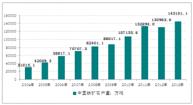 圖表:2013-2014年中國鐵礦石產(chǎn)量統(tǒng)計:億噸