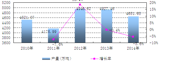 自2010年以來,中國純堿整體產(chǎn)量波動(dòng)較大,產(chǎn)量幾度出現(xiàn)下滑的現(xiàn)象,2011年、2013年、2014年這三年的氮肥產(chǎn)量均是負(fù)增長。2012年是近五年來氮肥增長率最高的一年,達(dá)到18.4%。以后的兩年產(chǎn)量均下滑。特別是2014年氮肥產(chǎn)量幾乎與2010年產(chǎn)量相近。