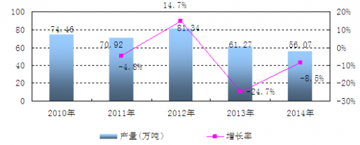 自2010年以來,中國殺蟲劑原藥產(chǎn)量整體波動較大,產(chǎn)量幾度出現(xiàn)下滑的現(xiàn)象,2011年、2013年、2014年這三年的殺蟲劑產(chǎn)量均是負增長。2012年是近五年來殺蟲劑增長率最高的一年,達到14.7%。以后的兩年產(chǎn)量均出現(xiàn)不同程度的下滑。特別是2014年殺蟲劑產(chǎn)量比2010年的74.46萬噸還要低,相比減產(chǎn)了18.39萬噸。