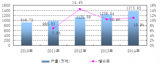2014年中國聚丙烯樹脂產(chǎn)量達(dá)1373.93萬噸,與2013年同期相比增長了10.9%。