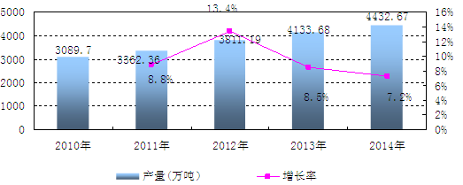 2012年中國化學纖維產量為3811.19萬噸,同比增長13.4%,2013年中國化學纖維產量為4133.68萬噸,同比增長8.5%,2014年中國化學纖維產量為4432.67萬噸,同比增長7.2%。