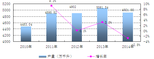 2014年中國(guó)啤酒產(chǎn)量達(dá)4921.85萬(wàn)千升,比去年同期下降2.8%。2010年到2013年啤酒產(chǎn)量保持增長(zhǎng),但是增長(zhǎng)量起伏較大,2011年增長(zhǎng)率高達(dá)9.3%,2012年增長(zhǎng)率僅有0.1%。2014年產(chǎn)量出現(xiàn)負(fù)增長(zhǎng),下降了2.8%,預(yù)計(jì)和人們的消費(fèi)觀念的改變有關(guān)。隨著人們的生活水平的提高,以及消費(fèi)方式的改變。預(yù)計(jì)2015年我國(guó)啤酒產(chǎn)量將呈增長(zhǎng)的趨勢(shì)。