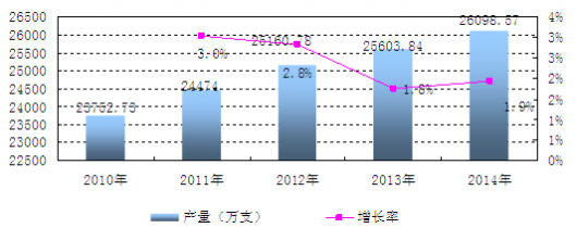 2014年中國卷煙產(chǎn)量達(dá)26098.45萬支,比去年同期增長1.9%。2010年到2014年我國卷煙產(chǎn)量一直都在穩(wěn)定緩慢的增長,增長率不超過5%。顯示了我國人民日益增強(qiáng)的健康消費(fèi)觀,預(yù)計(jì)2015年我國卷煙產(chǎn)量還會有所增加,但是產(chǎn)量增長速度不會超過5%。