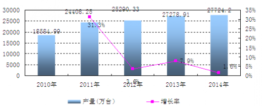 2014年我國筆記本電腦產(chǎn)量27724.2萬臺,比2013年同比下降1.6%。我國筆記本電腦產(chǎn)量整體呈上升趨勢,從2010年開始我國筆記本電腦市場需求增速明顯,在2011年增速達(dá)到最高,同比增長31.3%,從2011年后,其產(chǎn)量一直小幅增長,在2013年產(chǎn)量同比增長7.9%,2014年產(chǎn)量第一次出現(xiàn)負(fù)增長,相比2013年同比下降1.6%,據(jù)此推測我國筆記本電腦市場仍將有較為穩(wěn)定的變化,不會出現(xiàn)大波動。