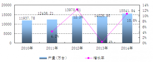 2014年我國(guó)彩電產(chǎn)量15541.94萬(wàn)臺(tái),比2013年同比增長(zhǎng)10.8%。我國(guó)彩電產(chǎn)量整體呈上升趨勢(shì),其中彩電產(chǎn)量在2012年增速達(dá)到最高點(diǎn),同比增長(zhǎng)12.3%,而相比2012年的旺季,2013年的產(chǎn)量則顯得冷淡的多,其產(chǎn)量同比微增0.4%,而2014年隨著智能家居行業(yè)的迅速崛起,彩電市場(chǎng)又出現(xiàn)較為明顯的增長(zhǎng),預(yù)計(jì)后期我國(guó)彩電市場(chǎng)仍有較大利好空間。