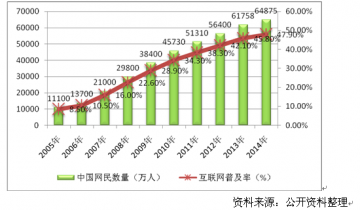 圖表:2013-2015年中國網(wǎng)民數(shù)量及互聯(lián)網(wǎng)滲透率