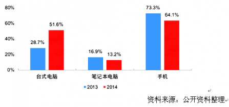 2014年新網(wǎng)民最主要的上網(wǎng)設(shè)備是手機(jī),使用率為64.1%,由于手機(jī)帶動網(wǎng)民增長的作用有所減弱,故新網(wǎng)民手機(jī)使用率低于2013年的73.3% 。由于2014年新增網(wǎng)民學(xué)生群體占比為38.8%,遠(yuǎn)高于老網(wǎng)民中的22.7%,而學(xué)生群體的上網(wǎng)場景多為學(xué)校、家庭,故新網(wǎng)民使用臺式電腦的比例相比2013年上升明顯,達(dá)51.6% 。