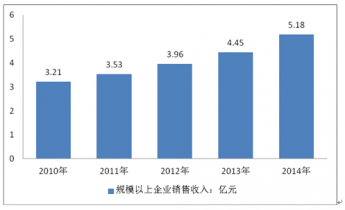 2010-2014年塑料板、管、型材的制造業(yè)規(guī)模以上企業(yè)銷售收入總額(億元)