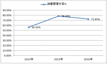 2014年我國(guó)智能馬桶蓋行業(yè)銷(xiāo)售額增長(zhǎng)率為56.5%,2015年約78.46%,2016年約72.65%。