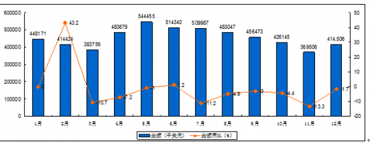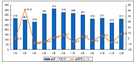 2015年1-12月中國(guó)冰箱出口金額統(tǒng)計(jì)圖