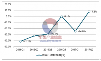 2016-2017年中國(guó)挖掘機(jī)庫(kù)存比年初增減走勢(shì)圖