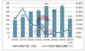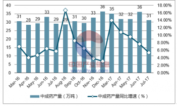 2017年1-7月中國(guó)中成藥產(chǎn)量為219.7萬(wàn)噸,同比增長(zhǎng)9.3%;2016年中國(guó)中成藥產(chǎn)量為361.1萬(wàn)噸,同比增長(zhǎng)6.2%。