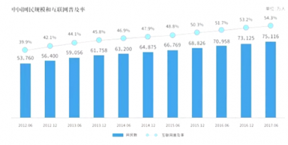 圖表:2010-2017年我國(guó)網(wǎng)民規(guī)模及互聯(lián)網(wǎng)普及率