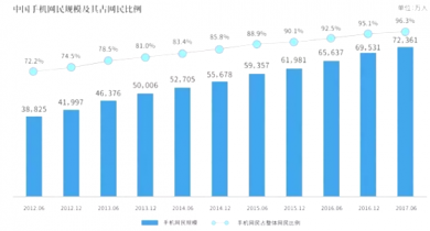 截至2017年6月,我國(guó)手機(jī)網(wǎng)民規(guī)模達(dá)7.24億,較2016年底增加2830萬(wàn)人。網(wǎng)民使用手機(jī)上網(wǎng)的比例由2016年底的95.1%提升至96.3%。
