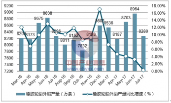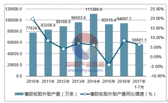 2017年1-7月中國橡膠輪胎外胎產(chǎn)量為56681.1萬條,同比增長6.5%;2016年中國橡膠輪胎外胎產(chǎn)量為94697.7萬條,同比增長8.6%。
