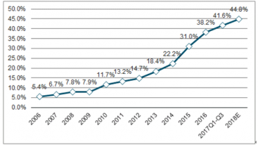 2006-2019年中國(guó)乘用車市場(chǎng)SUV滲透率
