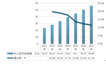 2011-2017年中國(guó)實(shí)心輪胎市場(chǎng)規(guī)模及增速