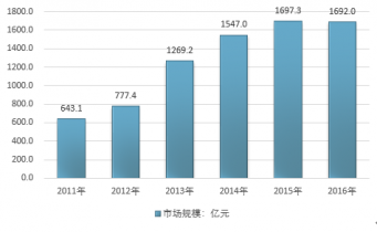 據(jù)統(tǒng)計,2013年以來,我國光纖光纜行業(yè)銷售收入增長較快,但2016年實現(xiàn)了負增長。2011-2016年,中國光纖光纜行業(yè)銷售收入從643.1億元上升至1692億元,年均復(fù)合增長率高達21.35%。